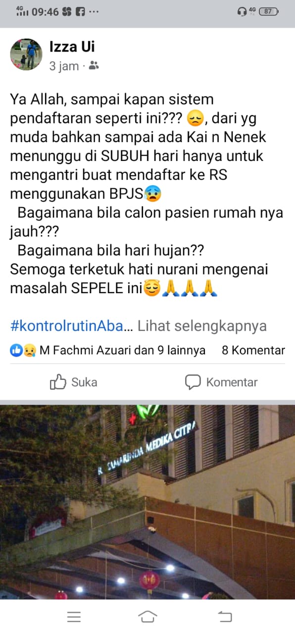 Melalui akun Facebook Izza Ui, ia mengatakan keprihatinannya terhadap pasien yang sejak subuh sudah antri untuk mendapatkan layanan kesehatan di RS SMC.