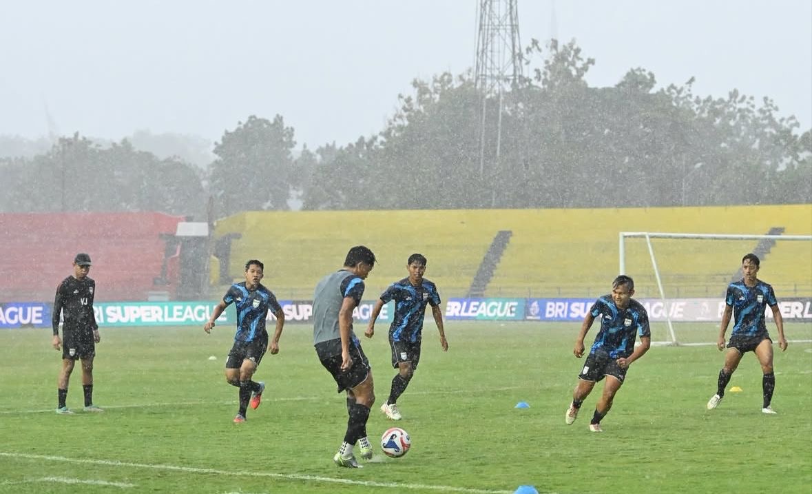 Suasana latihan terakhir skuad tim Borneo FC meski diguyur hujan jelang menghadapi Semen Padang, dalam laga yang berlangsung di Stadion H. Agus Salim, Minggu (9/11/2025) besok, foto by Borneo FC
